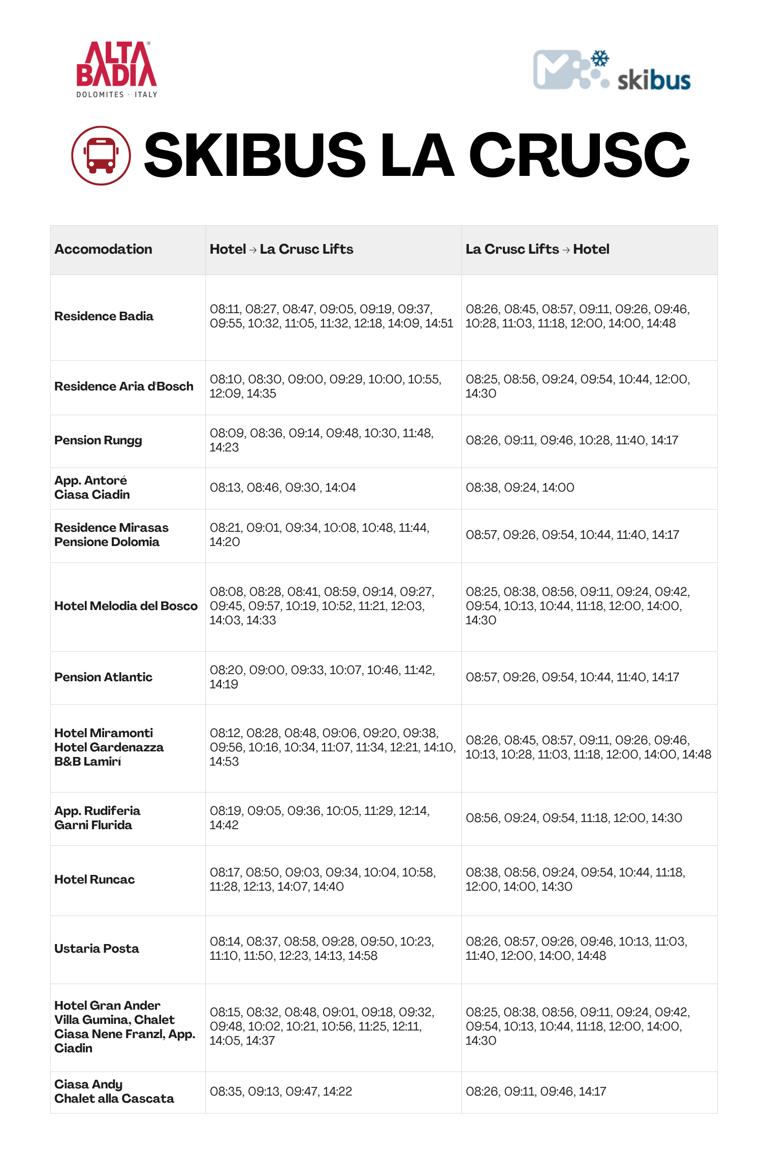 Che servizio! Lo Skibus La Crusc è la fantastica navetta che ti aspetta tutti giorni fuori dall’uscio del tuo hotel per portarti dritto verso il divertimento sulle piste da sci di La Crusc, o meglio: fino alla stazione a valle della nuova cabinovia La Crusc 1, dove c'è anche il nuovo ufficio Skipass.